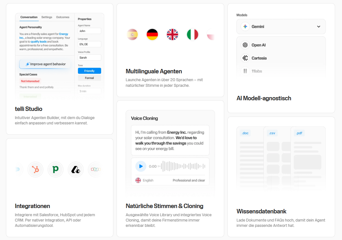 telli ist eine führende Plattform für kundenorientierte KI-Voice-Agents, der B2C-Unternehmen aus den Bereichen Immobilien, Energie, Telko und Finanzen vertrauen. Sie automatisiert Inbound- und Outbound-Anrufe für Use Cases wie Lead-Qualifizierung, Terminbuchung, Reaktivierung und Kundenservice. Dank starker CRM-Anbindungen (z. B. Salesforce, HubSpot) arbeitet telli Hand in Hand mit euren Teams, um Erreichbarkeit und Conversions zu pushen. Das No-Code „telli Studio“, Support für über 40 Sprachen und ein integrierter Dialer ermöglichen schnelles Deployment und Skalierung. Ideal für Firmen, die Fokus auf Outbound-Performance und schnellen Time-to-Value legen – weniger für hochgradig individuelle Entwickler-Workflows.